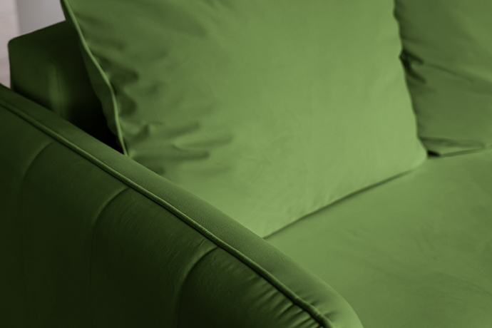 Обивка дивана - мягкий бархатистый премиальный велюр. Это красивая, тактильно приятная и очень практичная ткань. Загрязнения с нее удаляются легко и быстро. Устойчивость к истиранию по тесту Мартиндейла составляет > 70 000 циклов.