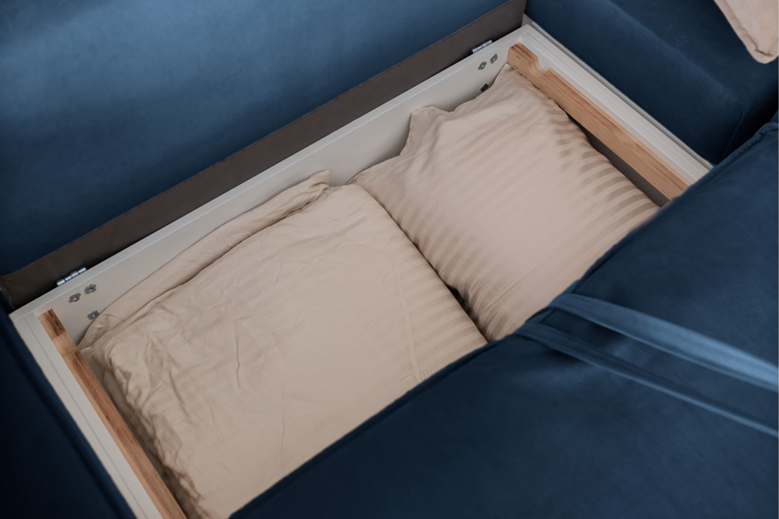 Под сиденьем каждого модуля находится бельевой ящик. В них поместится комплект постельного белья и 2 подушки. Бельевой короб выполнен из ламинированной мебельной плиты, направляющие из экологичной березовой фанеры высшего сорта.