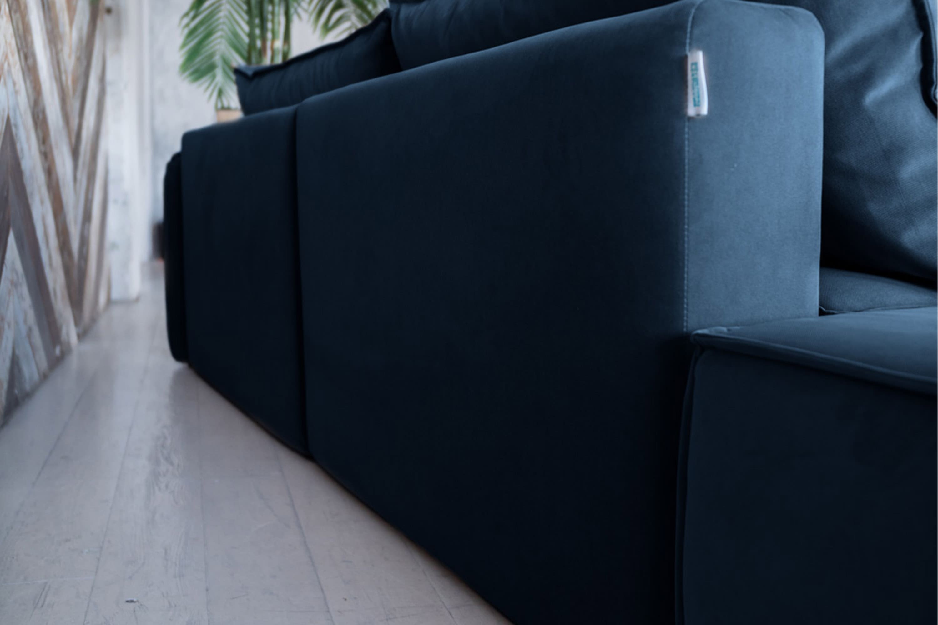 Обивка дивана - мягкий бархатистый премиальный велюр. Тонкая динамика узора обивки создаёт в пространстве ощущение лёгкости и движения. Технология Waterproof делает ткань устойчивой к влаге, и благодаря этому обивка долговечна и проста в уходе.