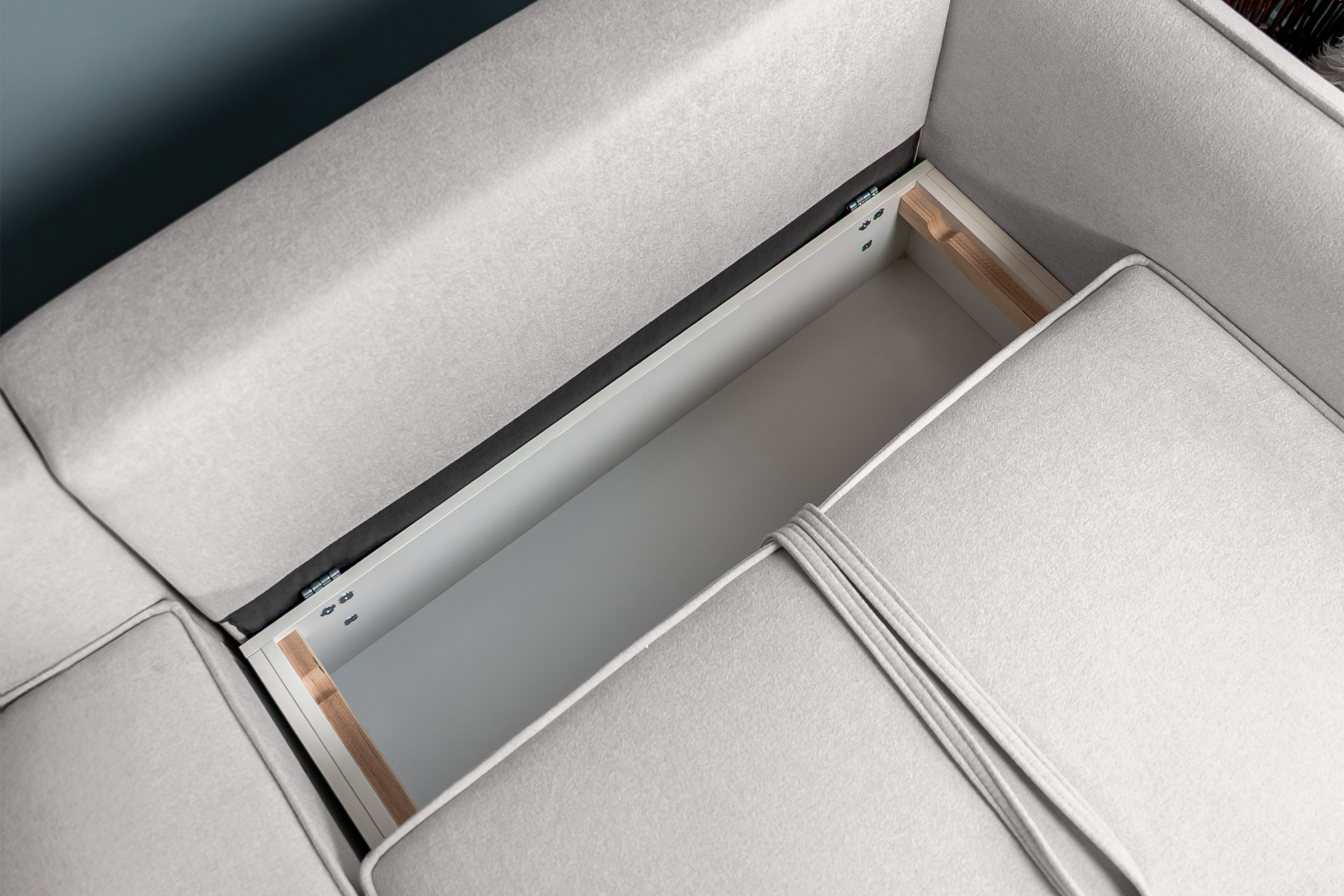 Под сиденьем каждого модуля находится бельевой ящик. В них поместится комплект постельного белья и 2 подушки. Бельевой короб выполнен из ламинированной мебельной плиты, направляющие из экологичной березовой фанеры высшего сорта.