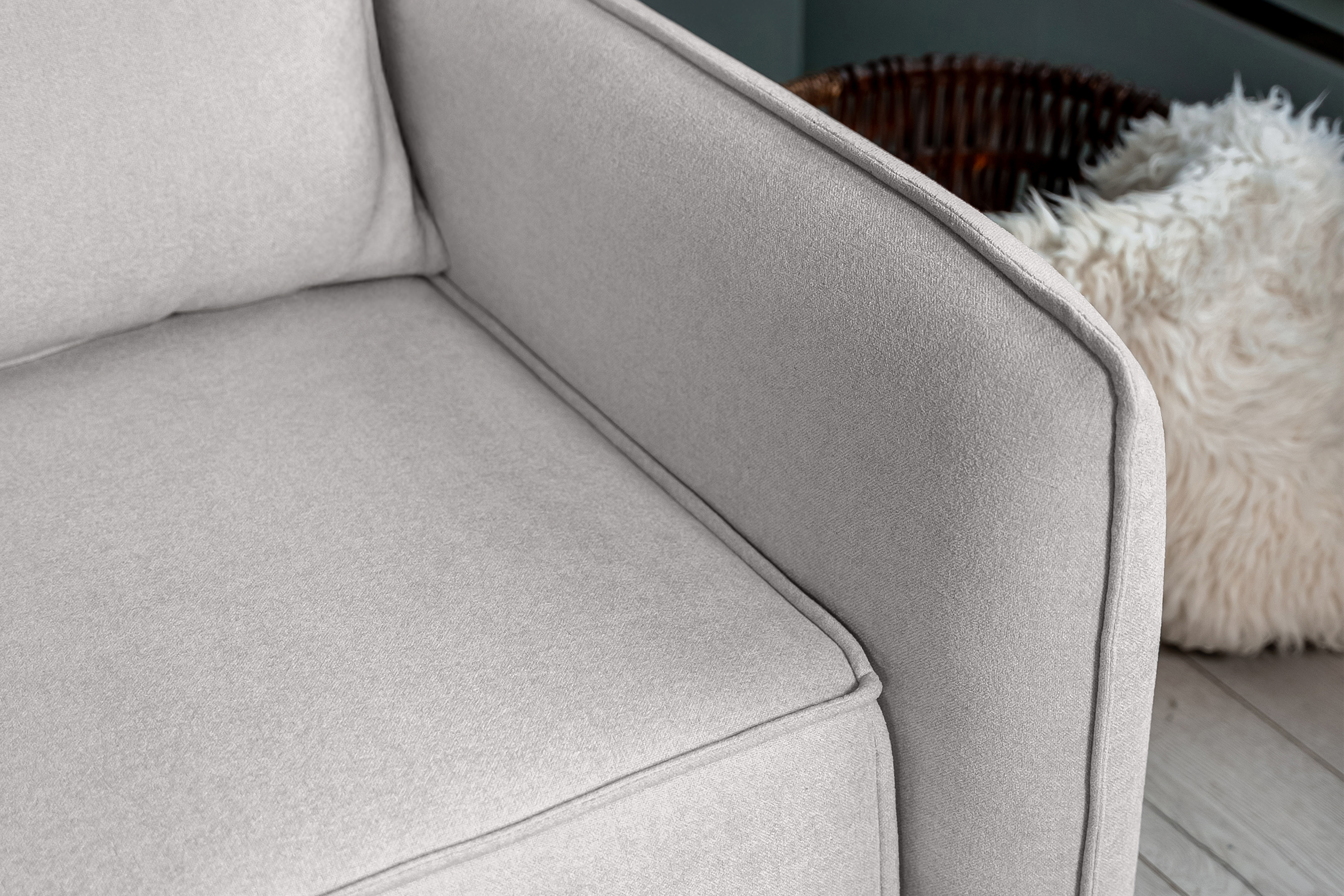 Узкие подлокотники экономят пространство. Французский шов по периметру подчеркивает геометрию формы.
