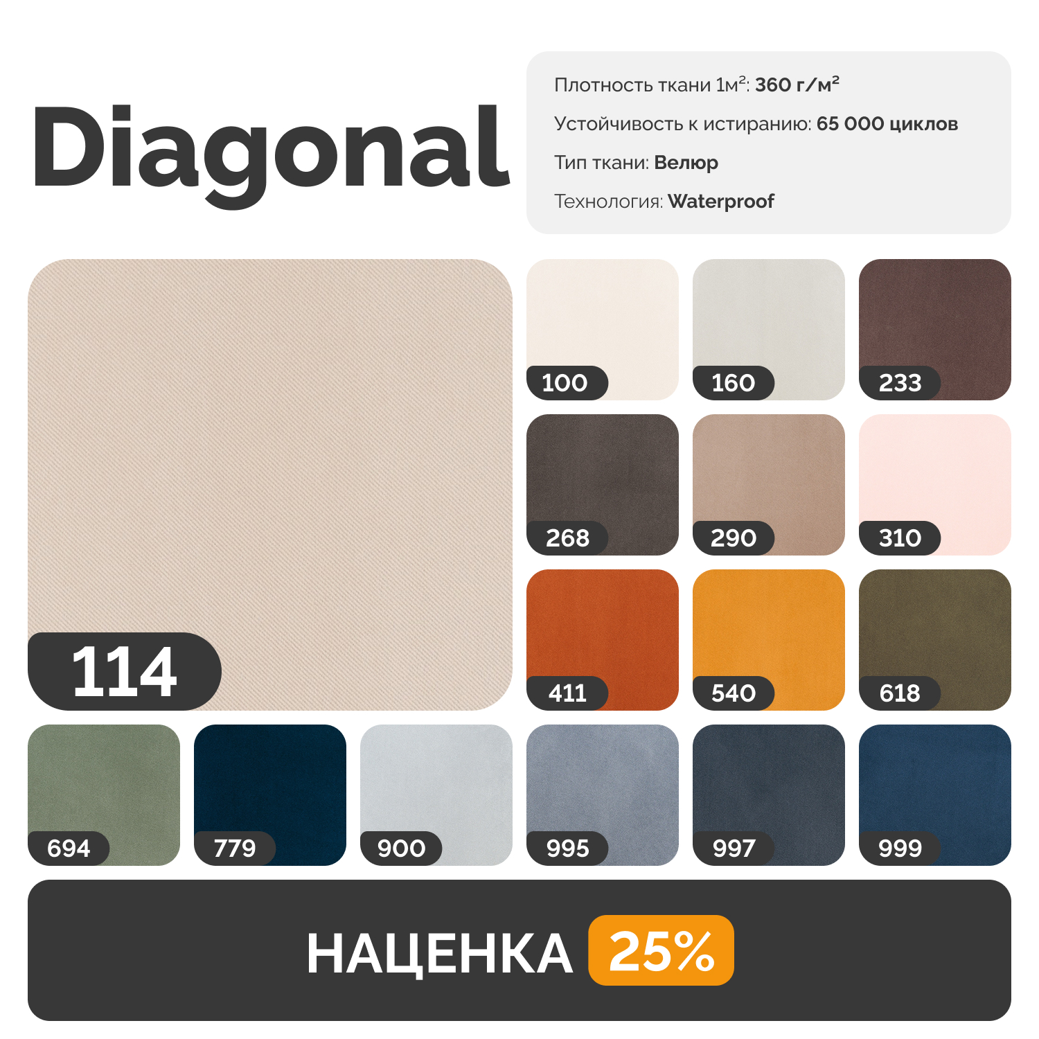 Коллекция DIAGONAL создана для тех, кто ценит стиль 70-х и эффектную геометрию. Эта ткань не просто дополняет интерьер – она привлекает внимание. Диагональный рубчик выглядит изысканно, подчёркивая формы мебели. А технология Waterproof делает его практичным даже в самых активных пространствах.