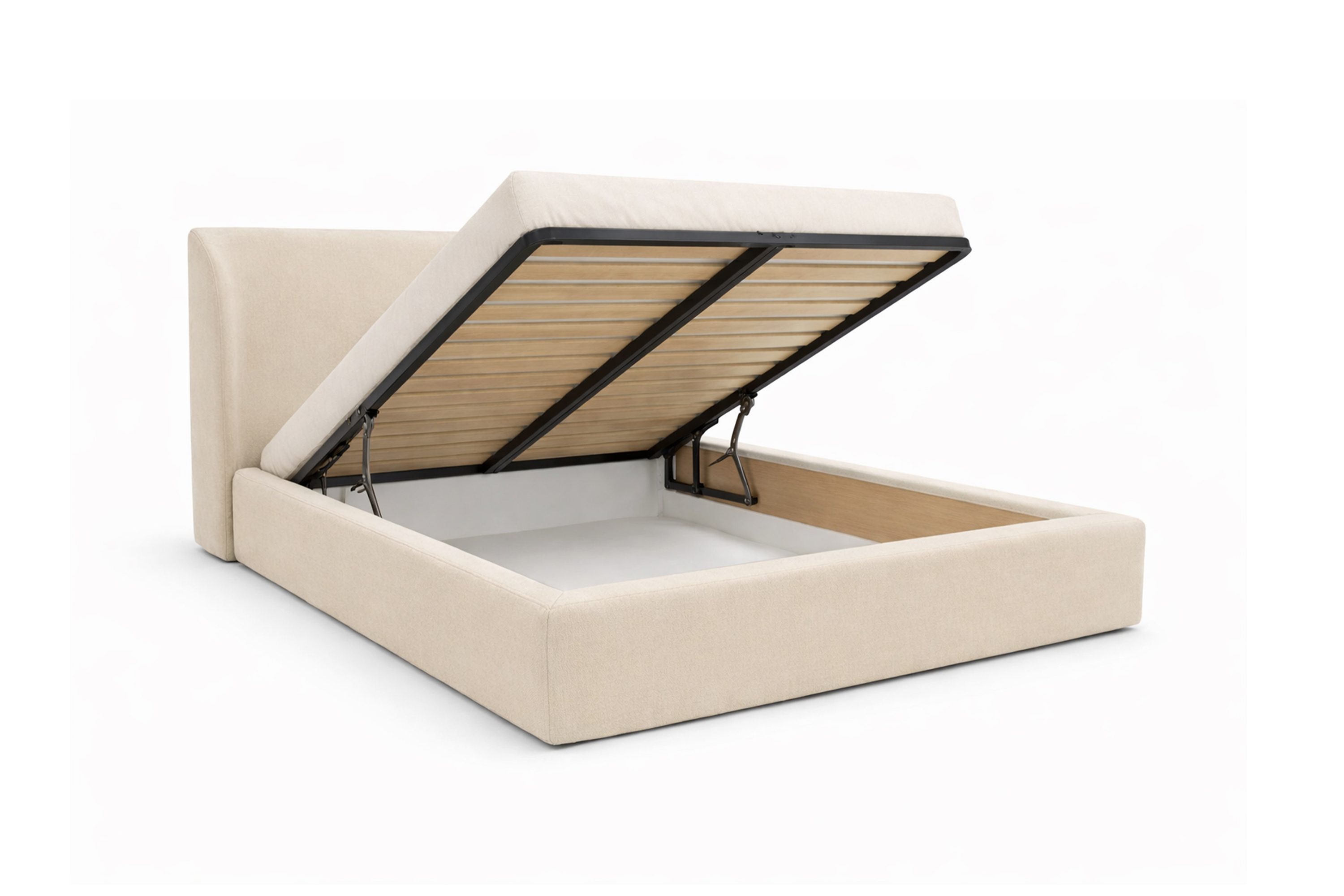 Плавный и тихий подъем обеспечивают качественные газлифты, рассчитанные на 30 лет службы. Механизм открывается легко, открывая доступ к вместительному отсеку для хранения постельных принадлежностей и сезонных вещей.