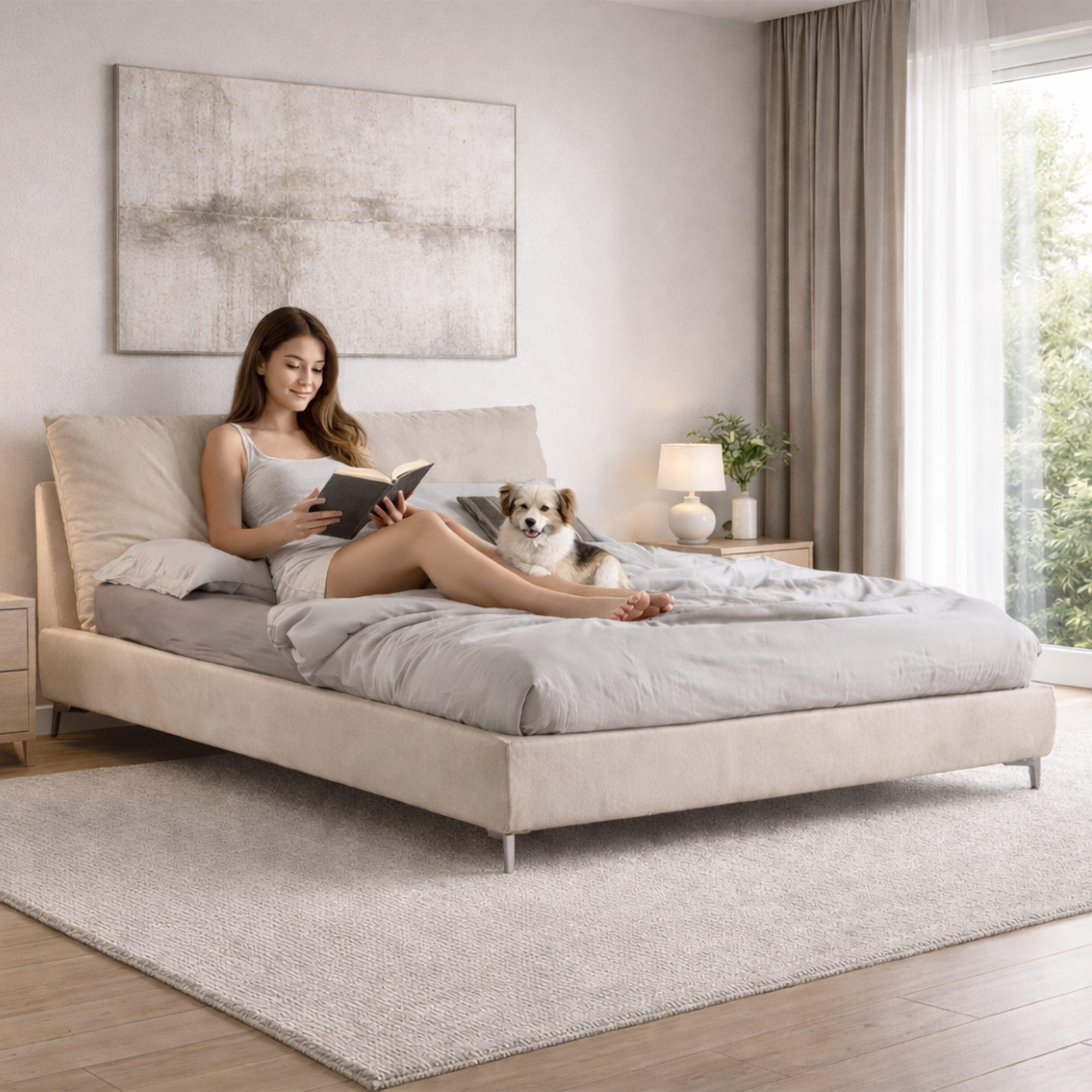 В основе кровати — надежное ортопедическое основание с прочными ламелями, равномерно распределяющими нагрузку и поддерживающими правильное положение тела во время сна. Такая конструкция подходит для ежедневного использования и любых типов матрасов.