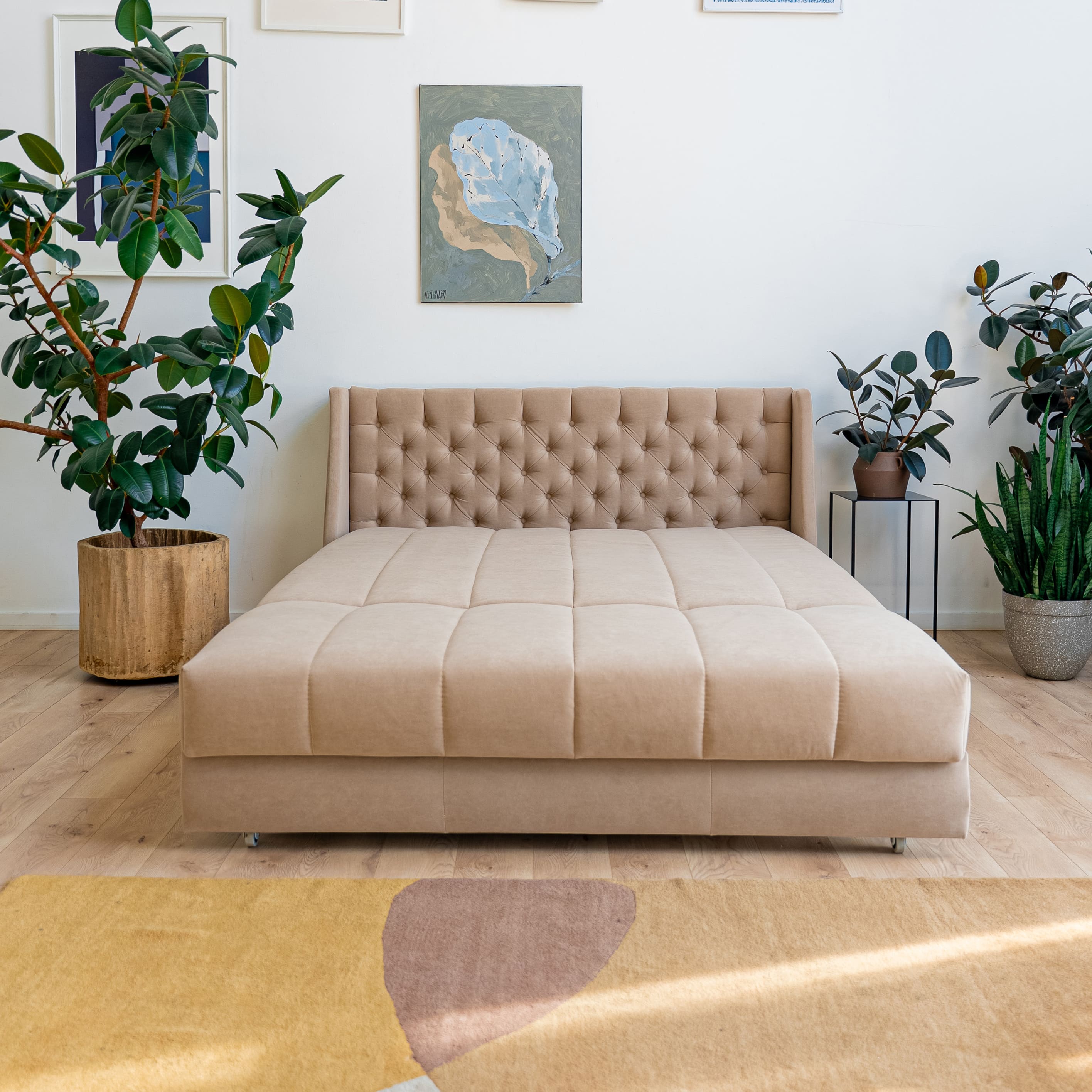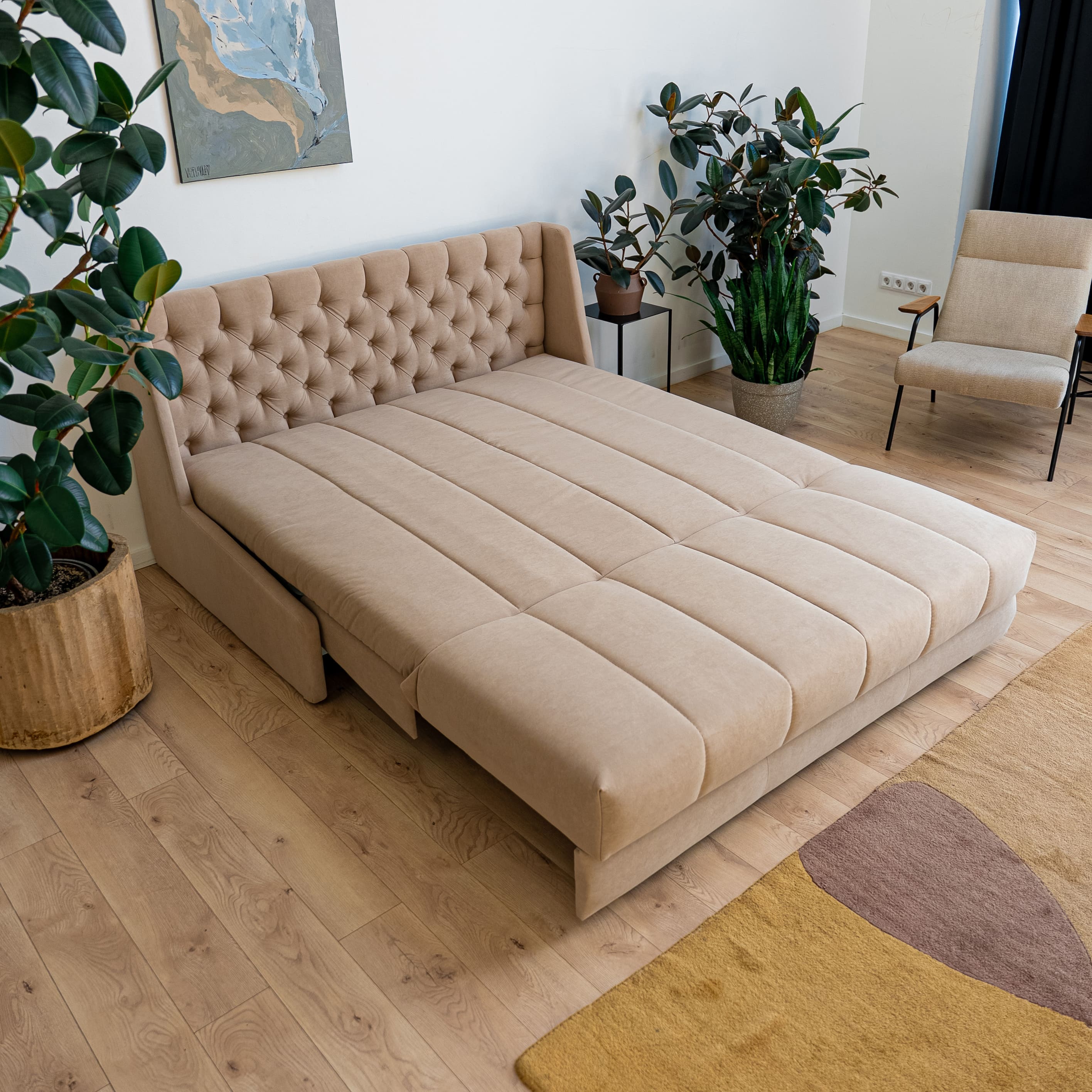 Эстетика дизайна. Высокая спинка с каретной стяжкой делает складную кровать стильной деталью интерьера. А спинка в основной ткани позволяет использовать её для зонирования пространства.