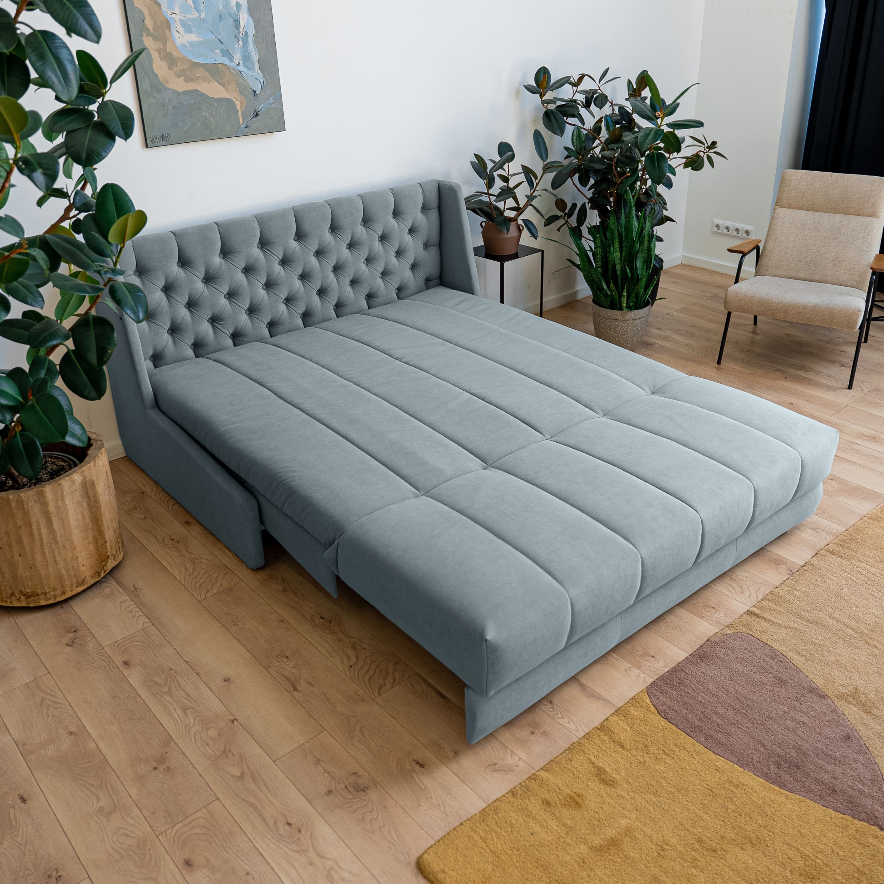 Эстетика дизайна. Высокая спинка с каретной стяжкой делает складную кровать стильной деталью интерьера. А спинка в основной ткани позволяет использовать её для зонирования пространства.
