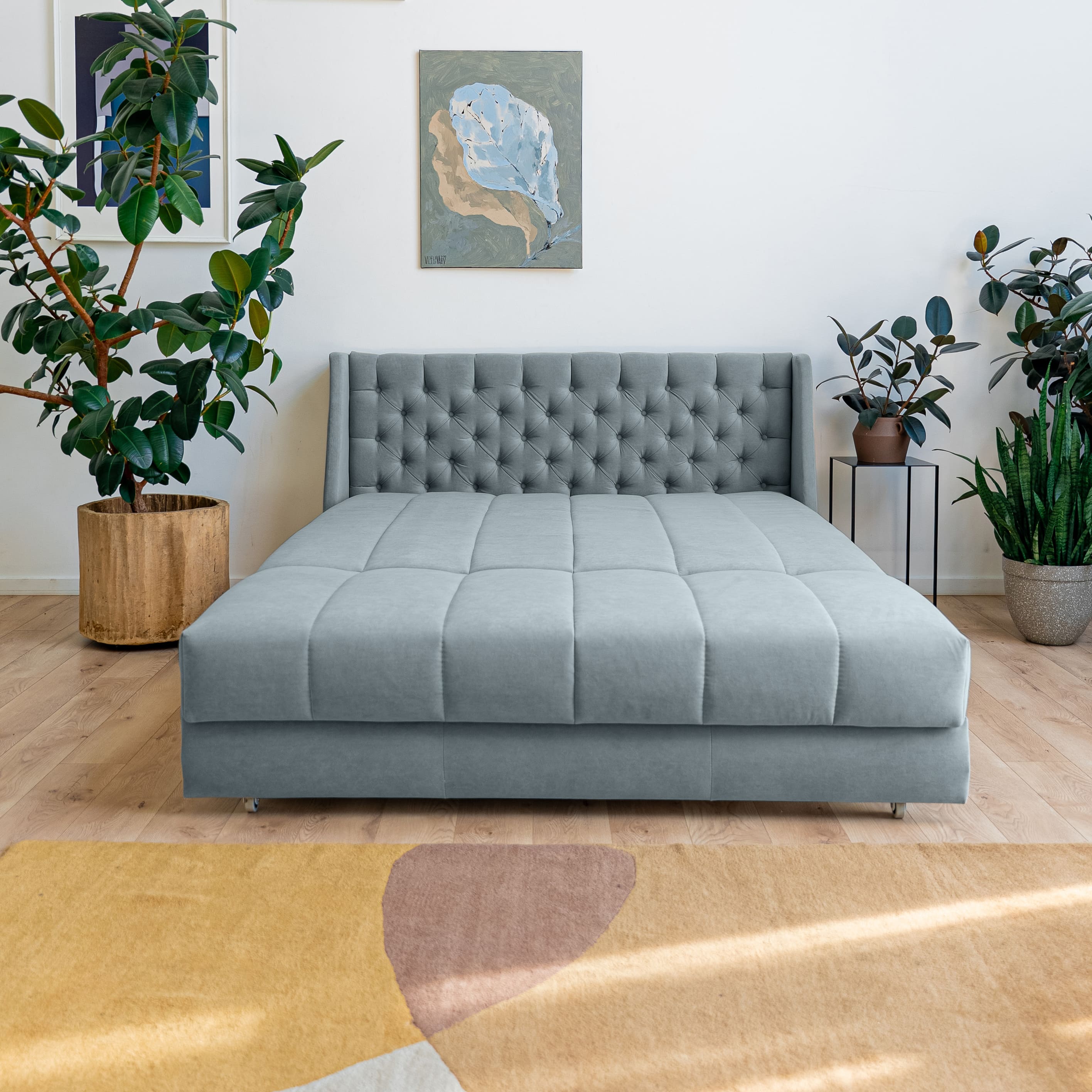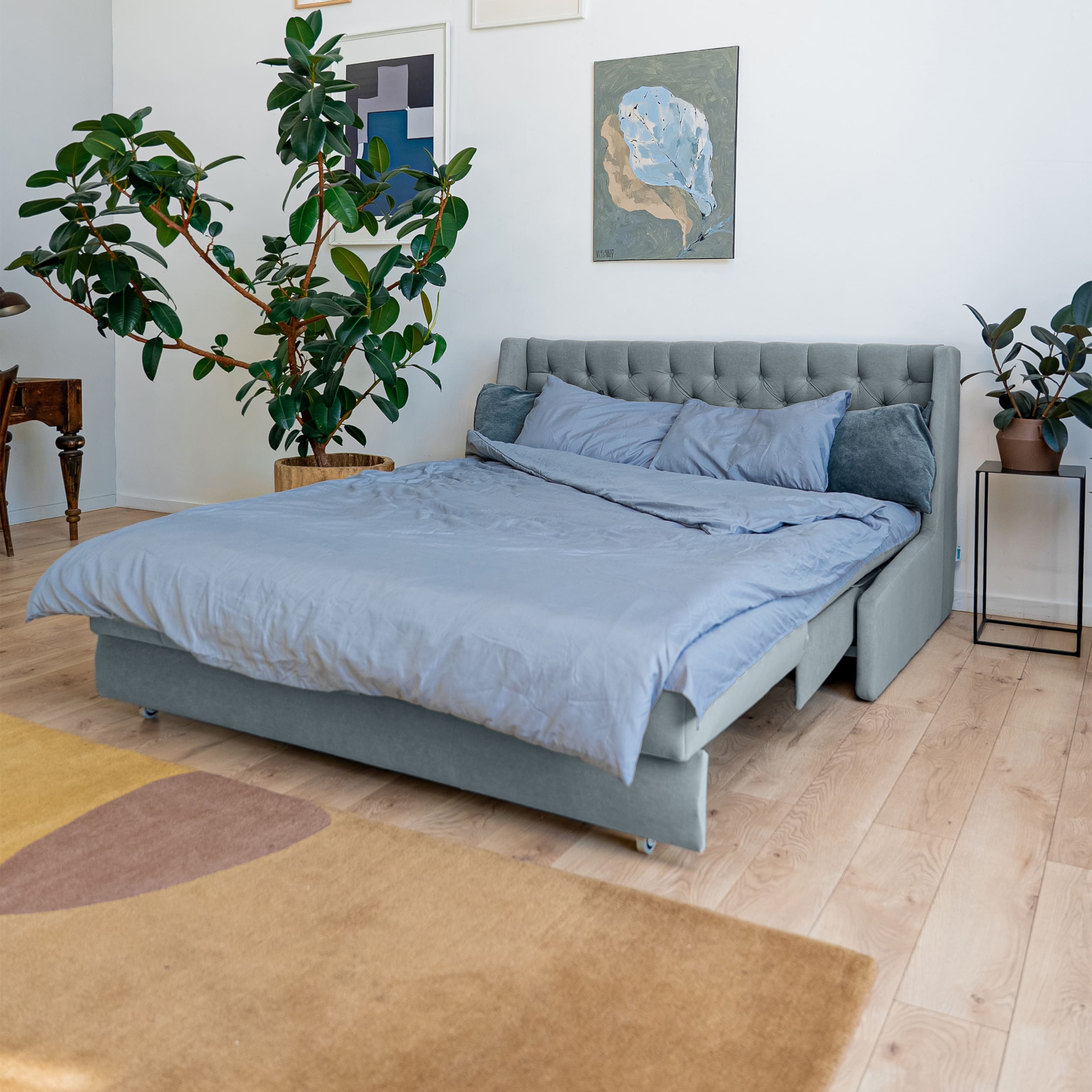Эстетика дизайна. Высокая спинка с каретной стяжкой делает складную кровать стильной деталью интерьера. А спинка в основной ткани позволяет использовать её для зонирования пространства.