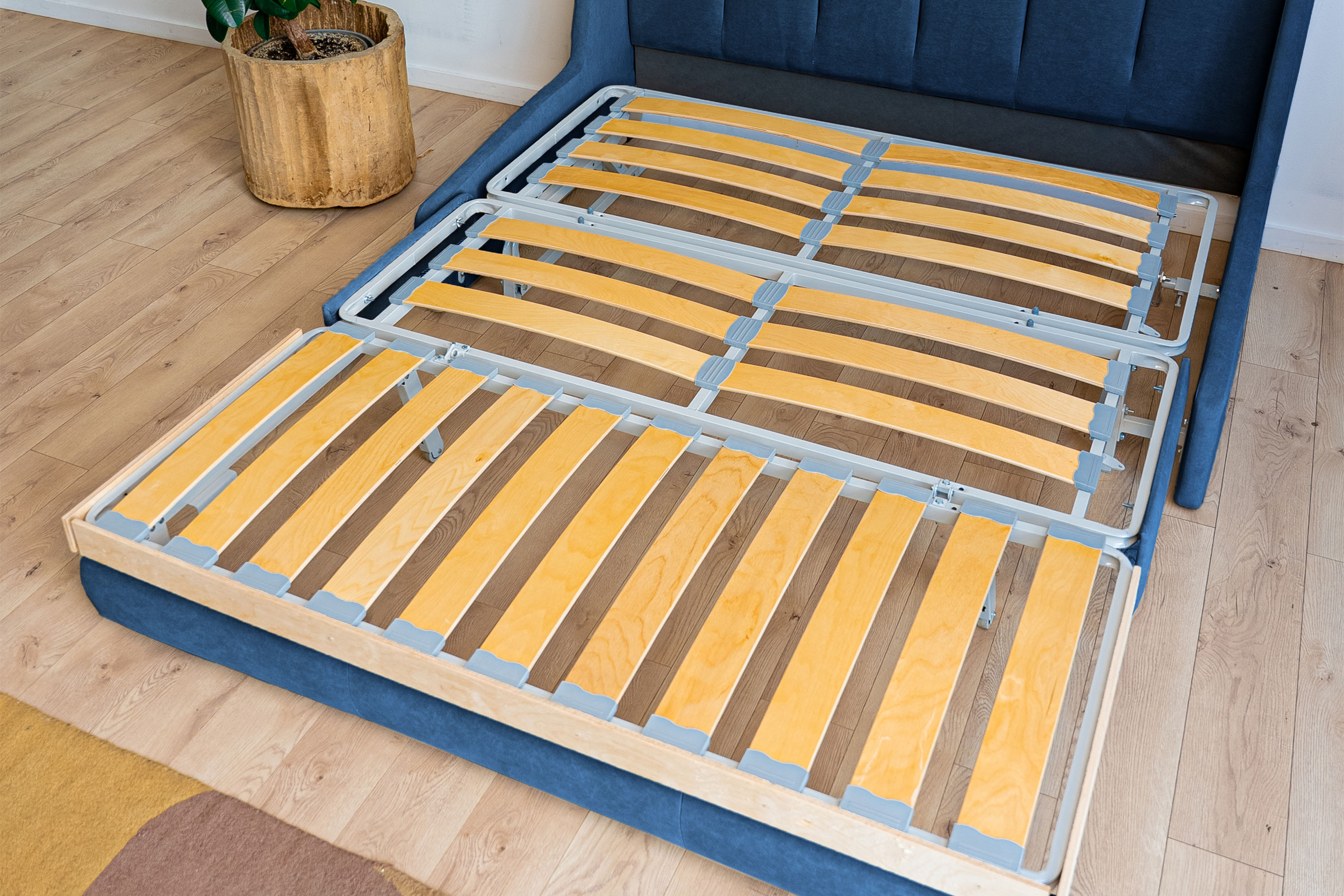 Комфорт стационарной кровати. Ровное спальное место без стыков и перепадов. Ортопедическая поддержка благодаря независимому пружинному блоку и ламелям.