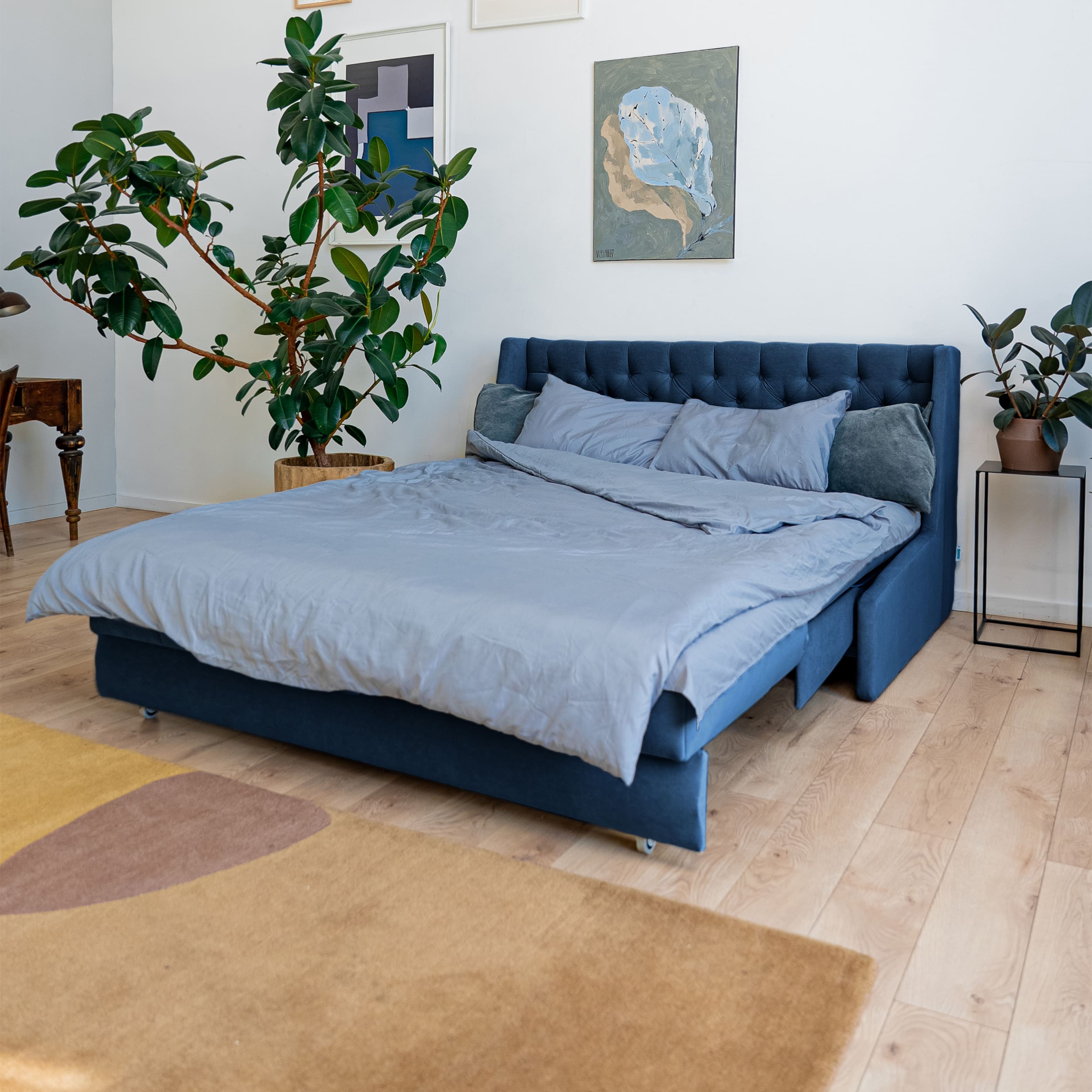 Высокая спинка с каретной стяжкой делает складную кровать стильной деталью интерьера. А спинка в основной ткани позволяет использовать её для зонирования пространства.