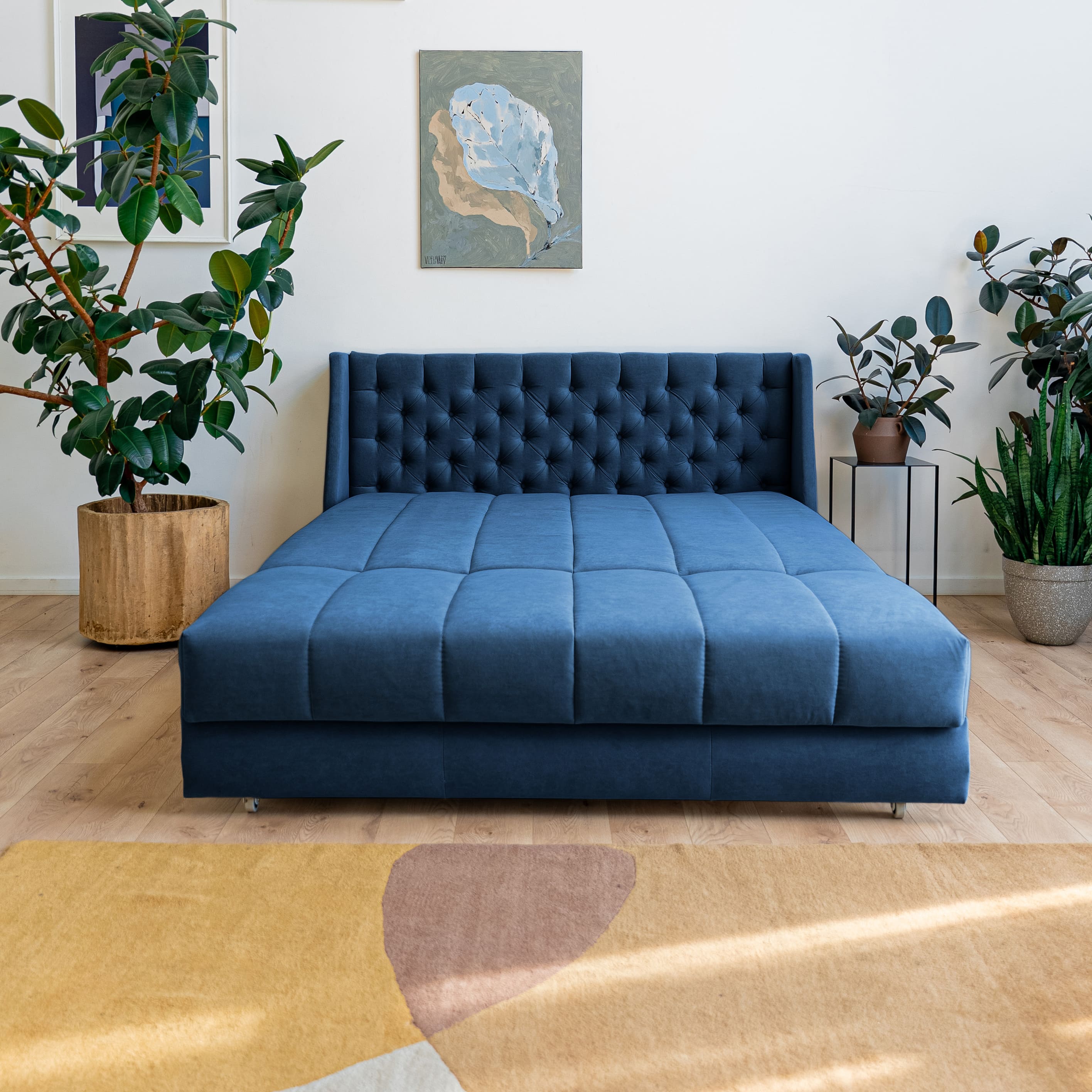 Эстетика дизайна. Высокая спинка с каретной стяжкой делает складную кровать стильной деталью интерьера. А спинка в основной ткани позволяет использовать её для зонирования пространства.