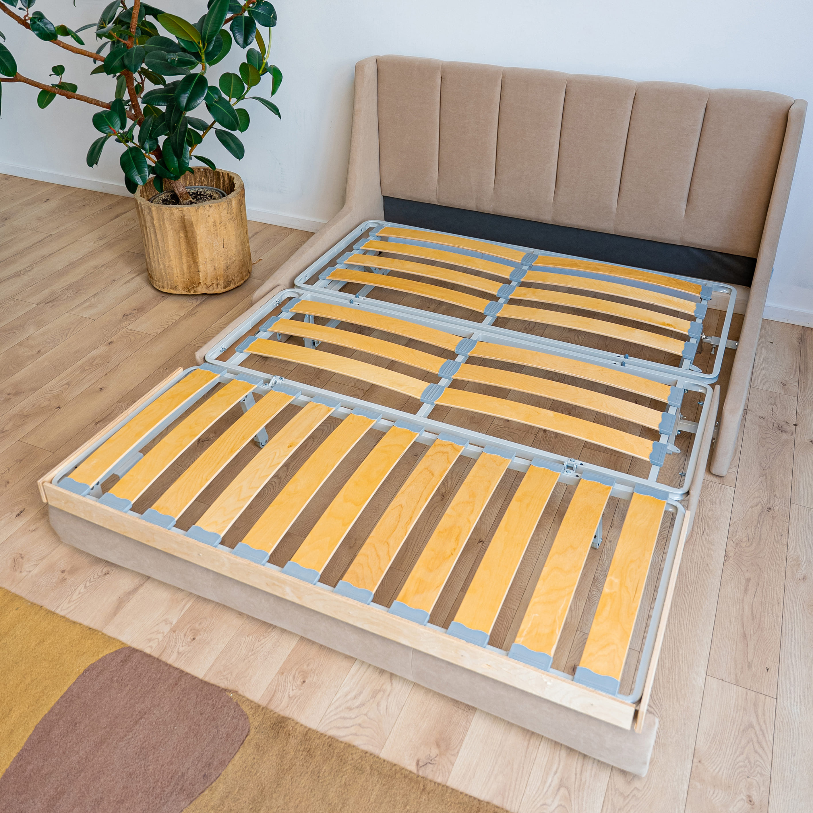 • Комфорт стационарной кровати. Ровное спальное место без стыков и перепадов. Ортопедическая поддержка благодаря независимому пружинному блоку и ламелям.