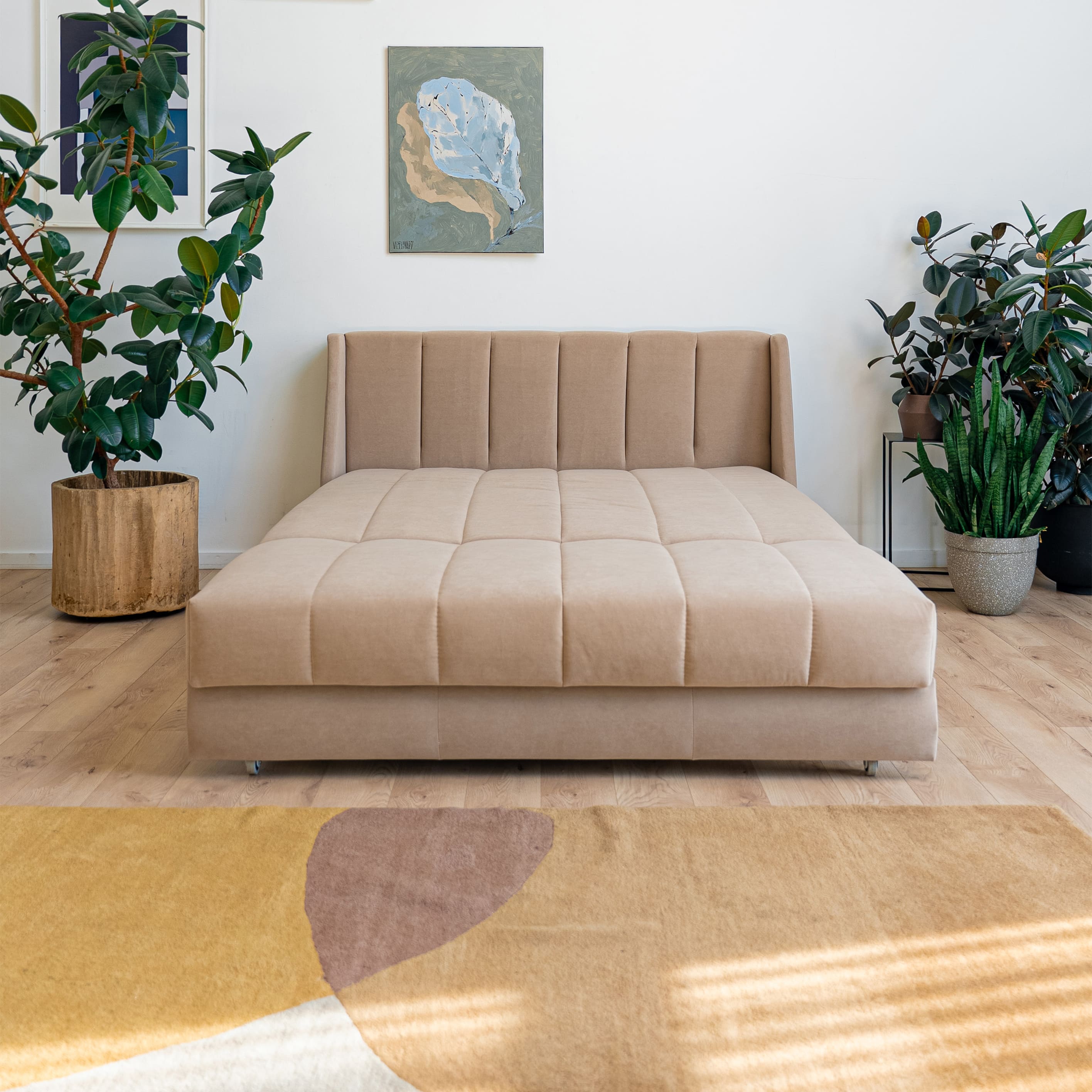 Эстетика дизайна. Высокая спинка с вертикальными утяжками делает складную кровать стильной деталью интерьера. А спинка в основной ткани позволяет использовать её для зонирования пространства.