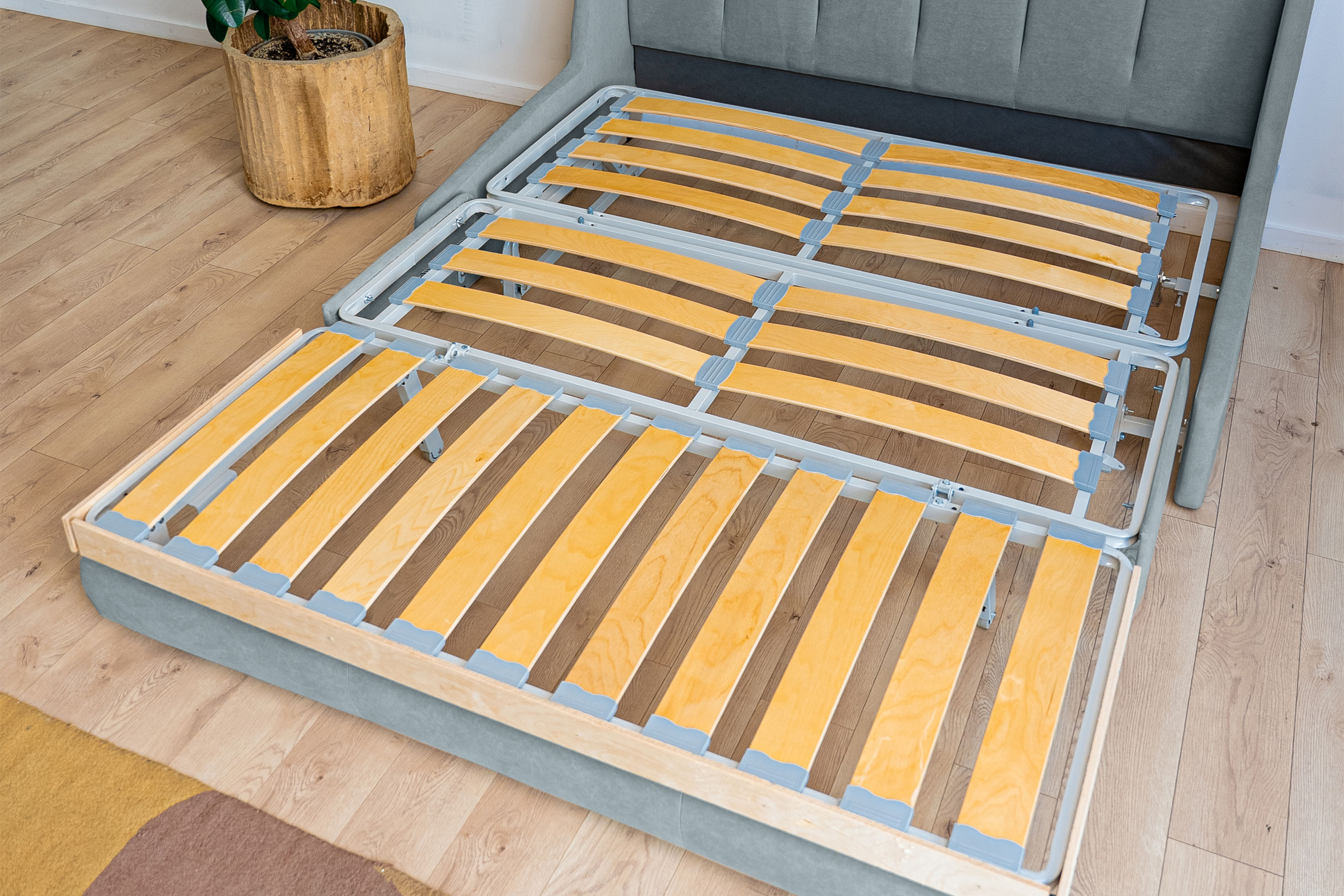 Комфорт стационарной кровати. Ровное спальное место без стыков и перепадов. Ортопедическая поддержка благодаря независимому пружинному блоку и ламелям.