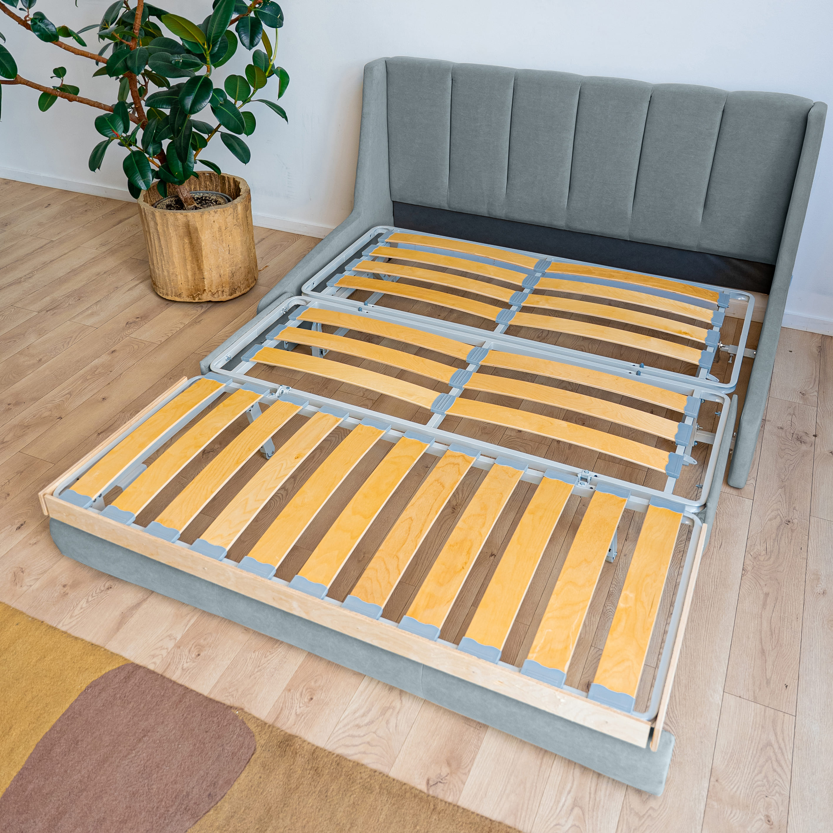 Комфорт стационарной кровати. Ровное спальное место без стыков и перепадов. Ортопедическая поддержка благодаря независимому пружинному блоку и ламелям.
